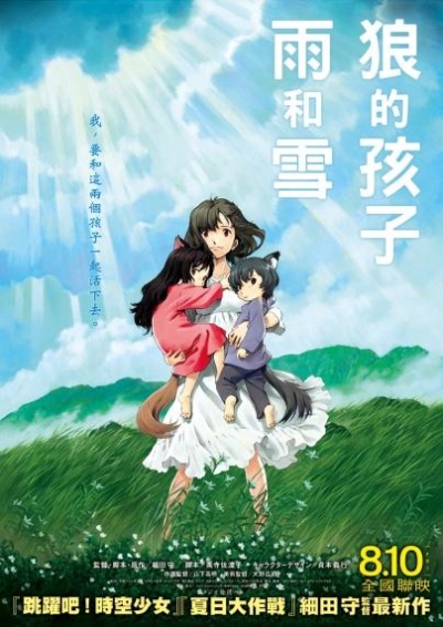日本票房總超過 40 億日圓,更在 40 多個國家(包括預定)上映的《狼的孩子雨和雪》,故事描述 19 歲的女主角「花」在大學就讀時認識了一位狼男,還是大學生的花,不顧一切的與狼男墜入愛河,甚至結婚生子。她生下了一對可愛的姊弟:「雪」和「雨」。他們一家四口就在城市的角落過著平靜溫馨的生活,狼男不幸忽然死亡;為了表達對狼男至死不逾的愛情與親情,花便以此為契機,帶著兩個孩子遠離都市,共同到名為田舍町的鄉下生活……。